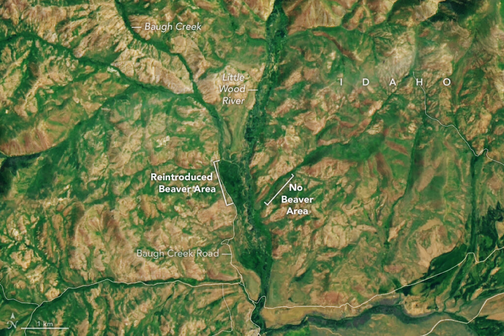 Yale Environment 360 reports that Baugh Creek in a remote Idaho valley has a newly-altered landscape as a result of beaver activity, as shown in newly released satellite imagery from NASA. Beavers erected dams that formed ponds and flooded meadows, supporting the growth of grasses and shrubs. A wide swath of healthy riparian vegetation now surrounds the stream, which is more verdant than other, nearby waterways. Its another case of nature’s engineers at work for nature.