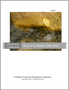 NEW 2017 State of the Mitigation Markets Report | Purchase the latest comprehensive State of the Markets report for Wetland, Stream and Species Conservation Banking showing ecosystem market trends, regional breakdowns, credit transactions, permitting information and more for this fast-growing industry. The high-value report provides charts, graphs and maps detailing the mitigation and conservation banking industry across the U.S. from 2000 – 2016. >Order Now